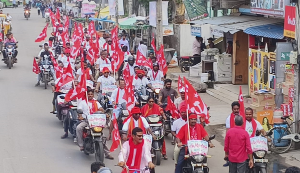 వీరఘట్టం (మన్యం) : విశాఖపట్నం స్టీల్ ప్లాంట్ అమ్మకం నిలిపివేయాలని కోరుతూ ... ఆదివారం వీరఘట్టం గ్రామంలో సిపిఎం ఆధ్వర్యంలో బైక్ ర్యాలీ నిర్వహించారు. నేతలు మాట్లాడుతూ ... విశాఖపట్నం స్టీల్ ప్లాంట్ను అమ్మేయాలని మోడీ ప్రభుత్వం నిర్ణయించిందని తెలుగు ప్రజలు పోరాడి 32 మంది ప్రాణత్యాగాలతో, 16 వేల మంది రైతుల 22 వేల ఎకరాల భూత్యాగ ఫలంతో లక్ష మందికి ఉపాధి కల్పిస్తున్న ప్లాంట్ ను రక్షించుకుని తీరతామని స్టీల్ ప్లాంట్ కార్మికులు, ప్రజలు గత 1000 రోజులకు పైగా పోరాడుతున్నారని తెలిపారు. అయినా కేంద్ర ప్రభుత్వ వైఖరిలో మార్పు లేదన్నారు. విశాఖ స్టీల్ ప్లాంట్ అమ్మకాన్ని నిలిపేయాలని డిమాండ్ చేశారు.