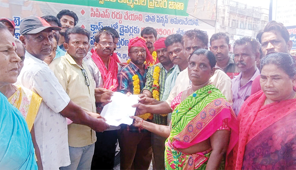 ప్రజాశక్తి - యంత్రాంగం : మున్సిపల్ పారిశుధ్య, ఇంజనీరింగ్ కాంట్రాక్టు, అవుట్ సోర్సింగ్ కార్మికులను పర్మినెంట్ చేయాలని, సిపిఎస్ రద్దు చేయాలని డిమాండ్ చేస్తూ ఎపి మున్సిపల్ వర్కర్స్ అండ్ ఎంప్లాయీస్ ఫెడరేషన్ (సిఐటియు) ఆధ్వర్యంలో చేపట్టిన జీపు జాతాలు బుధవారం 9వ రోజుకు చేరాయి. శ్రీకాకుళం జిల్లా ఇచ్ఛాపురంలో ప్రారంభమైన జాతా ఎన్టిఆర్ జిల్లాలోకి, సత్యసాయి జిల్లా హిందూపురం నుంచి బయలు దేరిన జాతా ప్రకాశం మీదుగా బాపట్ల జిల్లాలోకి ప్రవేశించింది. ఎన్టిఆర్ జిల్లాలో ఆంధ్రప్రదేశ్ మున్సిపల్ వర్కర్స్ అండ్ ఎంప్లాయిస్ యూనియన్ (సిఐటియు) రాష్ట్ర ప్రధాన కార్యదర్శి కె. ఉమామహేశ్వరరావు మాట్లాడుతూ.. మున్సిపల్ కాంట్రాక్టు, అవుట్ సోర్సింగ్ పారిశుధ్య కార్మికులను పర్మినెంట్ చేసి ఇఎస్ఐ కార్డ్ ఇవ్వాలని, పెండింగ్లో ఉన్న ఐదు నెలల హెల్త్ అలవెన్స్లు, సిపిఎస్ రద్దుచేసి పాత పెన్షన్ ఇవ్వాలని డిమాండ్ చేశారు. పారిశుధ్య కార్మికులకు ఇచ్చిన హామీలను ప్రధానమంత్రి నరేంద్ర మోడీ, ముఖ్యమంత్రి జగన్మోహన్రెడ్డి తక్షణమే అమలు చేయాలని కోరారు. మున్సిపల్ వర్కర్స్ అండ్ ఎంప్లాయిస్ యూనియన్ రాష్ట్ర కార్యదర్శి నూకరాజు, రాష్ట్ర నాయకులు లక్ష్మి, తదితరులు పాల్గొన్నారు. ప్రకాశం, బాపట్ల జిల్లాలో ఎపి మున్సిపల్ వర్కర్స్ అండ్ ఎంప్లాయిస్ ఫెడరేషన్ (సిఐటియు) రాష్ట్ర అధ్యక్షులు నాగభూషణం మాట్లాడుతూ.. సమాన పనికి సమాన వేతనం ఇవ్వడంతో పాటు కాంట్రాక్టు, అవుట్సోర్సింగ్ సిబ్బందిని వెంటనే పర్మినెంట్ చేయాలని డిమాండ్ చేశారు. ఎందరు పాలకులు మారిన మున్సిపల్ కార్మికుల జీవితాలు మారడం లేదన్నారు. మున్సిపల్ కార్మికులు, కాంట్రాక్ట్ అవుట్సోర్సింగ్ సిబ్బందికి 2019 ఎన్నికలకు ముందు ప్రతిపక్ష నేతగా జగన్మోహన్ రెడ్డి అనేక హామీలు ఇచ్చారని గుర్తు చేశారు. ముఖ్యమంత్రి అయ్యాక ఓ ఒక్క హామీనీ నెరవేర్చలేదని అన్నారు. తక్షణమే హామీలను అమలు చేయాలని డిమాండ్ చేశారు. కార్మికులకు సంక్షేమ పథకాలు అమలు చేయాలని, ఎపి ఎఫ్ఆర్ఎస్, ఇకెవైసి తదితర పేర్లతో కార్మికులను వేధింపులకు గురి చేయడం తగదన్నారు ఆయా మున్సిపాల్టీల్లో జాతాకు ఘన స్వాగతం లభించి