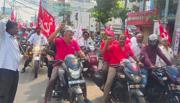 ప్రజాశక్తి - ఉక్కునగరం (విశాఖపట్నం):వైజాగ్ స్టీల్ప్లాంట్ పరిరక్షణ నినాదంతో ఉక్కు కార్మికులు విజయవాడకు కదిలారు. సిపిఎం ఆధ్వర్యాన బుధవారం జరిగే ప్రజారక్షణ భేరి సభలో పాల్గనేందుకు విశాఖలోని కూర్మన్నపాలెం కూడలిలోని ఉక్కు దీక్షా శిబిరం నుంచి వీరు బైకు ర్యాలీగా బయలుదేరారు. సిపిఎం, సిఐటియు కమిటీల ఆధ్వర్యంలో సాగిన ఈ కార్యక్రమంలో పెద్ద సంఖ్యలో కార్మికులు పాల్గన్నారు. తొలుత అంబేద్కర్ విగ్రహానికి పూలమాలలు వేసి నివాళులర్పించారు. అనంతరం చేపట్టిన బైకు ర్యాలీని ఉక్కు నిర్వాసిత మహిళ బడ్డ వెంకటమ్మ జెండా ఊపి ప్రారంభించారు. ఈ సందర్భంగా సిపిఎం రాష్ట్ర కార్యదర్శివర్గ సభ్యులు కె.లోకనాథం మాట్లాడుతూ.. స్టీల్ప్లాంట్ ప్రయివేటీకరణను కేంద్ర ప్రభుత్వం తక్షణం విరమించుకోవాలని డిమాండ్ చేశారు. మోడీ సర్కారు కుట్రలకు స్టీల్ప్లాంట్ బలైపోతుంటే రాష్ట్రంలోని జగన్ సర్కారు చేష్టలుడిగి చూస్తుండటం దారుణమన్నారు. ప్లాంట్ పరిరక్షణకు కేంద్రంపై ఒత్తిడి తేవడంలో రాష్ట్ర ప్రభుత్వం వైఫల్యం చెందిందన్నారు. పోరాటాలతోనే కర్మాగారాన్ని కాపాడుకోగలమని తెలిపారు. స్టీల్ప్లాంట్ ఎంప్లాయీస్ యూనియన్ (సిఐటియు) గౌరవాధ్యక్షులు జె.అయోధ్యరామ్ మాట్లాడుతూ.. ఛత్తీస్గఢ్లోని నాగర్నార్ స్టీల్ప్లాంట్ ప్రయివేటీకరణ విషయంలో రాష్ట్ర ప్రభుత్వ ఒత్తిడికి తలగ్గి కేంద్రం తన నిర్ణయాన్ని ఉపసంహరించుకున్న విషయాన్ని గుర్తుచేశారు. తమిళనాడు, కేరళలోని ప్రభుత్వ రంగ సంస్థలను పరిరక్షించుకునేందుకు ఆయా ముఖ్యమంత్రులు చేస్తోన్న కృషిని వివరించారు. అనకాపల్లి మీదుగా విజయవాడ వైపు బైక్ ర్యాలీ సాగింది.