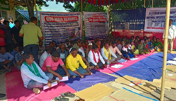 ప్రజాశక్తి - అరకులోయ, అనంతగిరి (అల్లూరి జిల్లా):తమ సమస్యలను పరిష్కరించాలని డిమాండ్ చేస్తూ ఎపి టూరిజం కార్మికులు చేపట్టిన సమ్మె సోమవారానికి మూడో రోజుకు చేరుకుంది. అధికారులు తమ సమస్యలను పరిష్కరించే వరకూ సమ్మెను విరమించేదిలేదని వారు స్పష్టం చేశారు. సమ్మెతో అరకులోయలోని మయూరి హరిత రిసార్ట్, హరిత వ్యాలీ రిసార్ట్, అనంతగిరి మండలంలోని బర్రా గుహలు, టైడా జంగిల్ బెల్స్, అనంతగిరి హరిత హిల్ యూనిట్లు మూతపడ్డాయి. ఈ నెల 15న రాష్ట్ర గవర్నర్ అబ్దుల్ నజీర్ అరకులోయ పర్యటన ఖరారు కావడం, పర్యాటక శాఖ అతిథి గృహాలు, రెస్టారెంట్లు మూతబడి ఉండడంతో అధికారుల్లోనూ గుబులు మొదలైంది. సోమవారం పాడేరు ఐటిడిఎ పిఒ అభిషేక్ అరకులోయలోని హరిత వ్యాలీ రిసార్ట్కు వెళ్లి సమ్మె విరమింపజేయడానికి చేసిన ప్రయత్నం ఫలించలేదు. వేరే ప్రాంతం నుంచి వర్కర్లను తీసుకొచ్చి పనులు చేయిస్తామని కొందరు అధికారులు బెదిరింపులకు పాల్పడినప్పటికీ కార్మికులు తిప్పికొట్టారు. అదే క్రమంలో పిఒకు సమస్యలపై వినతిపత్రం అందజేశారు. ఆయన స్పందిస్తూ మంగళవారం పాడేరు ఐటిడిఎ ఉన్నతాధికారులు, పోలీసు అధికారులు, కార్మిక సంఘాల నాయకులతో ప్రత్యేక సమావేశం ఏర్పాటు చేసి చర్చిస్తామని తెలిపారు. అనంతగిరి మండలంలో కార్మికుల సమ్మెకు పలు పార్టీల, ప్రజా సంఘాల మద్దతు లభించింది. జడ్పిటిసి గంగరాజు, సర్పంచ్లు మొస్య, అప్పారావు, సిపిఎం మండల కార్యదర్శి ఎస్ నాగులు, యుటిఎఫ్ జిల్లా కార్యదర్శి పి దేవుడు, గిరిజన, మహిళా సంఘాల నాయకులు మద్దతు తెలిపిన వారిలో ఉన్నారు. సమ్మె శిబిరం వద్ద కళారూపాలు, థింసా నృత్యం ప్రదర్శిస్తూ కార్మికులు తమ సమస్యలను అందరికీ అర్థమయ్యేలా చెబుతున్నారు.