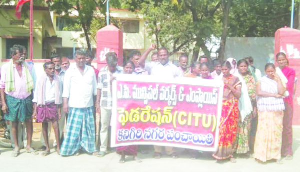 ప్రజాశక్తి-కనిగిరి: మున్సిపల్ కార్మికుల సమస్యలు వెంటనే పరిష్కరించాలని ఏపీ మున్సిపల్ వర్కర్స్ అండ్ ఎంప్లాయీస్ ఫెడరేషన్ (సిఐటియు) జిల్లా కమిటీ సభ్యులు ఎస్కె ఖాదర్వలి ప్రభుత్వాన్ని డిమాండ్ చేశారు. శనివారం మున్సిపల్ కార్మికుల సమస్యలను పరిష్కరించాలంటూ కనిగిరి పట్టణంలో మున్సిపల్ కార్మికులు నిరసన ర్యాలీ చేపట్టారు. అనంతరం మున్సిపల్ కార్యాలయం వద్ద నిరసన తెలియజేశారు. ఈ నిరసన కార్యక్రమాన్ని ఉద్దేశించి ఆయన మాట్లాడుతూ మున్సిపల్ కార్మికులను వెంటనే రెగ్యులర్ చేయాలని, అప్కాస్ నుంచి మినహాయించాలని కోరారు. రిటైర్మెంట్ బెనిఫిట్స్, పెన్షన్ సౌకర్యం కల్పించాలని, పదో పిఆర్సి ప్రకారం రూ.20 వేల వేతనం కొనసాగించాలని కోరారు. విధి నిర్వహణలో మృతి చెందిన కార్మికులకు రూ.పది లక్షల ఎక్స్గ్రేషియా చెల్లించాలని కోరారు. మున్సిపల్ కార్మికుల సమస్యల పరిష్కారం కోసం ఐక్య పోరాటాలు అవసరమని అన్నారు. మున్సిపల్ కార్మికుల పట్ల వైసిపి ప్రభుత్వం నిర్లక్ష్యం వీడి సమస్యలను పరిష్కరించాలని కోరారు. ఈ కార్యక్రమంలో యూనియన్ నాయకులు చార్లెస్, వి మార్క్, గరటయ్య, దస్తగిరి, రమణమ్మ, ఈశ్వరమ్మ, దానియేలు తదితరులు పాల్గొన్నారు.