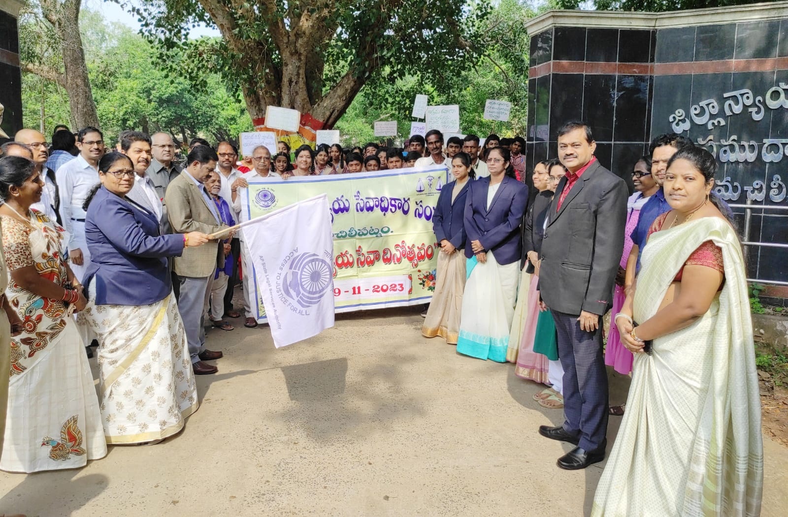 ప్రజాశక్తి-కలక్టరేట్ (కృష్ణా) : నూతన తరహా న్యాయసేవా శిబిరాలను ఏర్పాటు చేసి న్యాయ సేవలను ప్రజలకు మరింత చేరువ చేయడమే లక్ష్యం అని జిల్లా ప్రధాన న్యాయ మూర్తి అరుణ సారిక స్పష్టం చేశారు. జాతీయ న్యాయసేవా దినోత్సవం పురస్కరించుకుని గురువారం జిల్లా న్యాయసేవాధికార సంస్థ కష్ణా జిల్లా, మచిలీపట్నం వారి ఆధ్వర్యంలో ర్యాలీ నిర్వహించారు. తొలుత న్యాయ మూర్తి అరుణ సారిక మాట్లాడుతూ జిల్లా న్యాయసేవాధికార సంస్థ ఈ సంవత్సర కాలంలో 1,36,623 కేసులను లోక్ అదాలత్ ల ద్వారా పరిష్కరించడం జరిగిందన్నారు. 540 న్యాయవిజ్ఞాన సదస్సులను నిర్వహించి, 389 మందికి న్యాయసహాయం అందించామన్నారు. ప్రజలందరూ కూడా ఈ న్యాయసేవా ధికార సంస్థ సేవలను ఉపయోగించు కోవాలని కార్యదర్శి కె వి రామకష్ణయ్య తెలిపారు. ఈ కార్యక్రమంలో పలువురు న్యాయమూర్తులు, న్యాయ వాదులు, పోలీసులు, విద్యార్థిని విద్యార్థులు పాల్గొన్నారు.