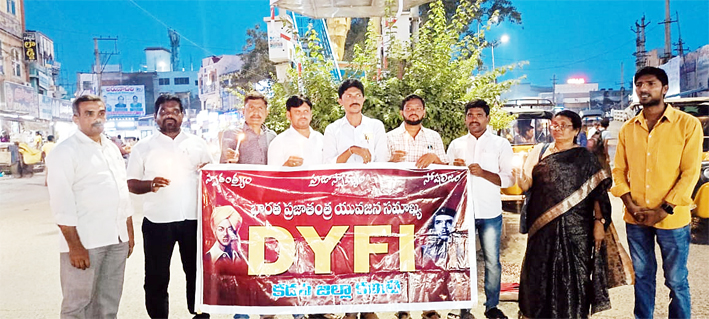 కడప అర్బన్ విజయనగరం జిల్లాలో రైలు ప్రమాద ఘటన చాలా బాధాకరం అని మతులకు డివైఎఫ్ఐ జిల్లా కమిటీిగా నివాళులు అర్పిస్తున్నమని, వారి కుటుంబాలకు ప్రగాఢ సానుభూతి తెలుపుతున్నామని డివైఎఫ్ఐ జిల్లా కార్యదర్శి వీరనాల శివకుమార్ అన్నారు. సోమవారం స్థానిక పులే సర్కిల్ లో డివైఎఫ్ఐ అధ్వర్యంలో కొవ్వొత్తులతో నివాళి అర్పించారు. ఈ సందర్భంగా ఆయన మాట్లాడుతూ నిత్యం దేశంలో ఏదోఒక చోట రైలు ప్రమాదాలు సంఘటనలు జరుగుతున్నాయని ఆవేదన వ్యక్తం చేశారు. మొన్న ఒడిస్సాలో భారీ రైలు ప్రమాద ఘటన మరువక ముందే మన రాష్ట్రంలో విజయనగరం జిల్లాలో రైలు ప్రమాద ఘటన జరగడం శోచనీయమని పేర్కొన్నారు. రెండు ప్రమాద ఘటనలలో సిగలింగ్ వ్యవస్థ కారణంగానే అధికారులు చెబుతున్నారని తెలిపారు. మారుతున్న కాలంలో పెరుగుతున్న టెక్నాలజీ ద్వారా ఇంకా సిగలింగ్ లోపం కారణంగా ప్రమాద ఘటనలు చోటుచేసుకోవడం దురదష్టకరం అన్నారు. కేంద్రం ఇప్పటికైనా గుర్తించి రైల్వే సిగలింగ్ వ్యవస్థను పటిష్టం చేయాలని డిమాండ్ చేశారు. మరోవైపు పని భారం తో ప్రమాదాలు జరుగుతున్నాయన్నారు. వెంటనే రైల్వేలో ఖాళీ పోస్టులను భర్తీ చేయాలని డిమాండ్ చేశారు. ప్రమాదంలో గాయపడిన వారికి సరైన సదుపాయాలతో చికిత్స చేయాలని, మెరుగైన వైద్యం అందించాలని రాష్ట్ర ప్రభుత్వాన్ని కోరుతున్నామన్నారు. కార్యక్రమంలో డివైఎఫ్ఐ నగర అధ్యక్ష, కార్యదర్శులు షాకీర్, డిఎం ఓబులేష్, నగర ఉపాధ్యక్షులు విజరు, ఉదరు పాల్గొన్నారు.