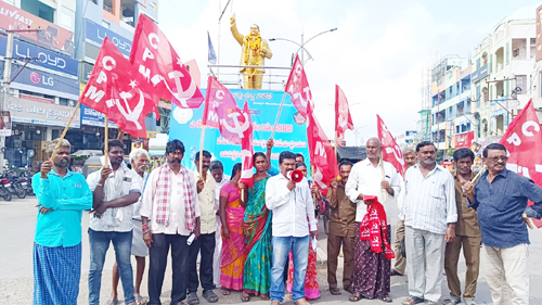 నిత్యవసర వస్తువులు ధరలు ఎన్నడూ లేని విధంగా పెరిగాయని సిపిఎం మండల కార్యదర్శి తంగిరాల వెంకటేశ్వర్లు అన్నారు. పట్టణంలోని అంబేద్కర్ విగ్రహం వద్ద ప్రజా రక్షణ భేరీ బస్సు యాత్రను జయప్రదం చేయాలని మండల పాదయాత్రను గురువారం ప్రారంభించారు. మహిళా కార్మికుల సైతం మేమున్నామని ప్రజారక్షణ భేరీ బస్సుయాత్ర కరపత్రం పంపిణీ చేశారు. ఈ సందర్భంగా తంగిరాల వెంకటేశ్వర్లు మాట్లాడుతూ ఈనెల 7న జరిగే సిపిఎం బస్సు యాత్ర జయప్రదం చేయాలని కోరారు. పట్టణ, గ్రామీణ ప్రాంతం కార్మిక, కర్షకులు, మేధావులు అధిక సంఖ్యలో పాల్గొనాలని కోరారు. రాష్ట్రంలో విద్యుత్ ఛార్జీలు, సర్ఛార్జీలు, ఇంధన చార్జీల పేరుతో ప్రభుత్వం ప్రజల నడ్డి విరుస్తుందని ఆరోపించారు. అద్దంకి ప్రాంతంలో రోడ్డు ప్రమాదాలు జరిగి అనేకమంది ప్రాణాలు కోల్పోతున్నారని అన్నారు. మరణించిన వారి కుటుంబాలు వీధిపాలవుతున్నాయని అన్నారు. ప్రమాదాలకు కారణం బైపాస్ రోడ్డు లేకపోవడమేనని అన్నారు. అంతర్గత రోడ్లు, మంచినీటి పైపులు వేసేందుకు త్రవ్వడం వలన రోడ్లు గుంతలమయం అయ్యాయని అన్నారు. పట్టణ ప్రజల సమస్యలు పట్టించుకునే నాధుడే కరువయ్యారని అన్నారు. కార్యక్రమంలో సిపిఎం నాయకులు, కార్యకర్తలు, మహిళలుపాల్గొన్నారు.