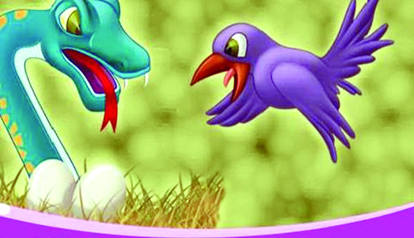 పుట్ట నుండి పాము బయటికి వచ్చి పారిపోవడానికి ప్రయత్నించింది. ఆకాశంలో ఎగురుతున్న గ్రద్ద పామును చూసి, తన కాళ్ళతో తన్నుకొని పోయి, కొండపై పెట్టుకుని తినేసింది.