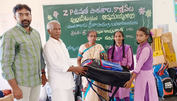 ప్రజాశక్తి - పుల్లంపేట : మండల పరిధిలోని కొత్తపేట జిల్లా పరిషత్ హై స్కూల్లో చదువుతున్న విద్యార్థులకు ఆదివారం నాడు దాతలు శ్రీ మాడ రవిశంకర్, రామ శాంతి దంపతులు గతంలో జరిగిన క్రికెట్, బాల్ బ్యాట్మెంటన్, బ్యాట్మెంటన్, క్రీడలలో మండల, నియోజకవర్గ, జిల్లా, రాష్ట్ర, మరియు సౌత్ జోన్ క్రీడలలో పాల్గొని అద్భుత ప్రతిభ కనబరిచి నందుకుగాను పాఠశాల ఫిజికల్ డైరెక్టర్ డాక్టర్ బాల శేఖర్ అభ్యర్థన మేరకు దాతలు విద్యార్థులకు క్రీడా సామాగ్రి పంపిణీ చేయడం జరిగింది. ఈ సందర్భంగా దాతలు మాట్లాడుతూ క్రికెట్ టెన్నిస్ బాల్ మొదలగు క్రీడలలో బాగా రాణించి పాఠశాల మరియు గ్రామం ప్రతిష్టలు పెంచడం వల్ల వారిని క్రీడలలో అన్ని విధాలుగా ప్రోత్సహించాలని ఉద్దేశంతో ఈ క్రీడా సామాగ్రిని పాఠశాలకు అందిస్తున్నట్లు వారు తెలియజేశారు. విద్యార్థులు ఇంకా మెరుగైన ఫలితాలు సాధించి జాతీయ, అంతర్జాతీయ క్రీడాకారులుగా ఎదగాలని ఆకాంక్షించారు. పాఠశాల ప్రధానోపాధ్యాయురాలు జయలక్ష్మి మాట్లాడుతూ పాఠశాలకు క్రీడ సామాగ్రిని ఎంపిక చేయడం పట్ల దాతలను ప్రత్యేకంగా అభినందించారు. గతంలో వారు చేసిన సేవలను కొనియాడారు. ఈ కార్యక్రమంలో విద్యార్థులు పాఠశాల సిబ్బంది పాల్గొన్నారు.